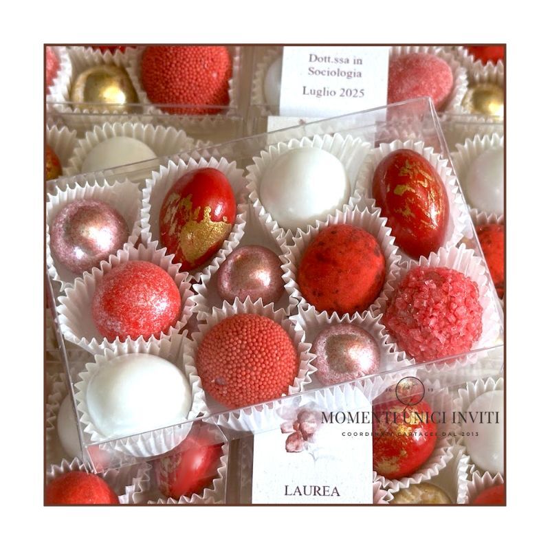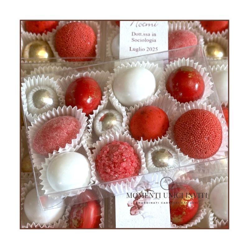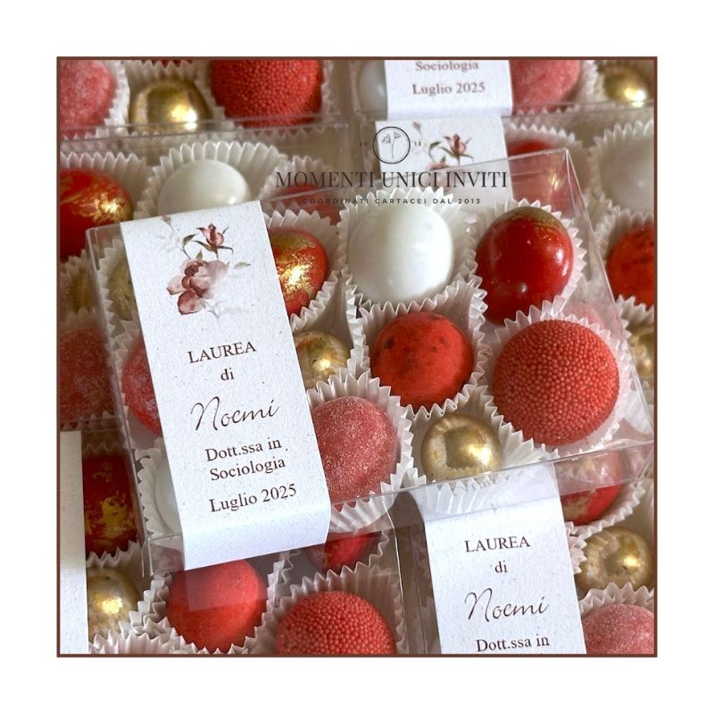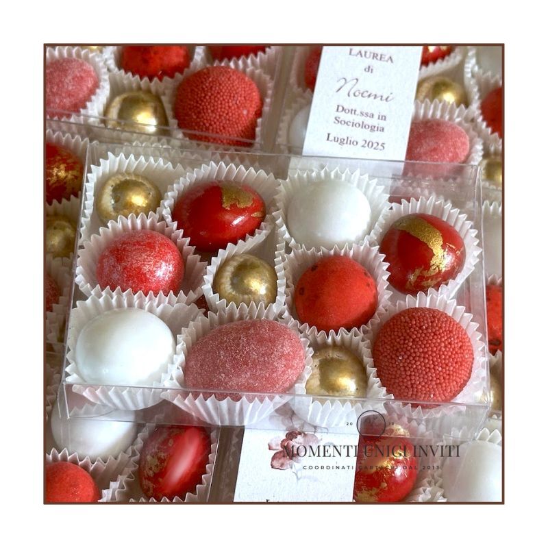 Questa scatolina degustazione confetti è una bellissima idea regalo o bomboniera ideale per Laurea. La box contiene 11 confetti di vari gusti e colori, ognuno posizionato sul proprio pirottino di carta. Grafica a scelta fra quelle da noi proposte. Potrete scegliere di personalizzare la box con sfere confettate oro, argento o oro rosa.