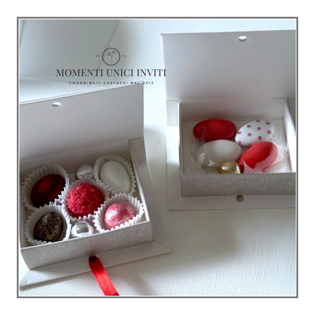 Potrete scegliere di acquistare la scatolina con 5 confetti (vari gusti e colori nei toni del rosso che saranno confezionati all’interno di una bustina in cellophane alimentare) o la scatolina con 7 confetti su pirottino (vari gusti e colori nei toni del rosso). In fase di acquisto, selezionate semplicemente la quantità di confetti che desiderate: la grafica ce la comunicherete quando avrete effettuato l’ordine e verrete contatti per definire i dettagli dell’ordine.