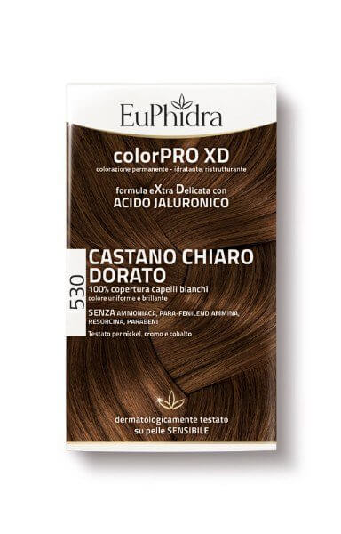 Tinta per Capelli Colorazione Ultra Delicata CASTANO CHIARO DORATO 530 EUPHIDRA COLORPRO Tintura permanente per capelli Euphidra con colorazione ultradelicata colore pieno, zero prurito, copertura dei capelli bianchi al 100%, senza ammoniaca, resorcina, parabeni, siliconi. Dermatologicamente testata e testata anche per Nichel, Cromo e Cobalto: Senza ammoniaca, resorcina, parabeni Senza siliconi, parafenilendiammina Delicatezza infinita: zero prurito, rispetta il cuoio capelluto Colore pieno e brillante Tenuta e lunga durata del colore Riproducibilità di tono e riflessi Copertura perfetta e omogenea dei capelli bianchi Con Proteine della Seta: proteggono e riparanoil capello é sicuro Sicurezza garantita daZeta Farmaceutici. I processi produttivi sonocertificati GMP (Good Manufacturing Practice) dal Ministero della Salute Test di tollerabilità cutanea su volontari umani sotto controllo dermatologico Testata pernichel, cromo e cobalto Test microbiologici: libero da contaminazioni Utilizzo Applicazione facile: per un risultato professionale e senza macchia Non cola: la consistenza gel e il beccuccio applicatore rendono la distribuzione pratica e omogenea Il flacone “squeeze” particolarmente morbido facilita la fuoriuscita del prodotto durante l’applicazione Il sistema click-open semplifica l’apertura del flacone: basta una leggera pressione del pollice sulla parte superiore del beccuccio per togliere il sigillo. Non servono forbici Guanti usa e getta e istruzioni dettagliate nella confezione